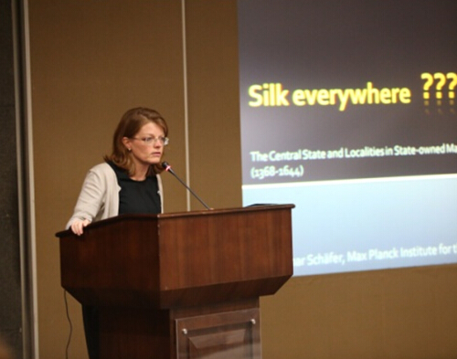 德国马普学会(MPIWG)柏林科学史研究所所长、维尔茨堡大学博士Dagmar Schaefer 以《权力与丝绸:明代(1368-1644)国有制造业的中央和地方》为主题对明朝初期皇室礼服的物流组织情况进行了研究,其中包括了十四世纪的汉人世界国有丝绸制造业的结构和影响,她认为其中两个历史编纂方面的问题值得注意:第一、物质文明和文学记载之间的比较;第二,分析的观点是怎样的。