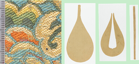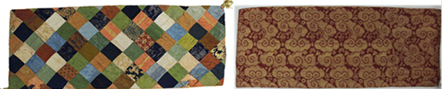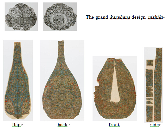 琵琶袋从形式上看是用于贮存一种四弦琵琶。四弦琵琶据说起源于波斯,很早就进入中国,并在奈良时代进入日本。现在,此件琵琶袋的缝纫线已经被切割,所以布片之间是不相连的,各个部件都是单独存在。琵琶包的前片布料是锦,背面的布片是白色的平纹丝绸。包面的图案从前片延伸到整个包体。