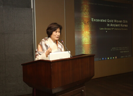 韩国传统纺织研究所所长、韩国传统文化学校教授沈莲玉对古代韩国(高丽王朝晚期)的织金丝绸出土物进行了阐述。
