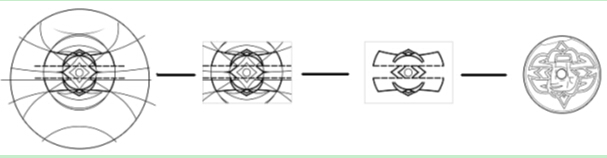 大气光象在各个遗址图像中的应用与内涵问题,指出包括吴江县梅堰镇东北袁家埭陶罐“太阳(大气光象).蚕”图的这类有关太阳大气光象的图像,又按照不同的晕弧组合分别演化为良渚文化中的冠状器、三叉形器、耘田器、各类神面。这其中的神人像,包括神人、神兽面,其中的神人、神兽单个造型是对应于太阳大气光象的,其组合也统一于太阳大气光象(图七)。认为则晚期的神人、饕餮应该都具大气光象内涵或由其延伸的内涵。