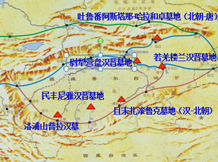 民丰尼雅汉晋墓地:该墓地出土了大量珍贵丝绸文物,包括大量的织锦,因其织造费工费时,最能反映织造技术水平。从实物看,汉晋时期,五种色彩的织锦发现最多,如尼雅“万世如意”锦、“长乐大明光”锦、“元和元年”锦等,这种织锦幅面没有,花纹流畅自如,极为华丽,代表了汉晋织锦的最高技术水平。另外,尼雅出土“五星出东方利中国”锦、“恩泽下岁大孰常葆子孙息弟兄茂盛无极”锦、“金池凤”锦等都是这方面的杰作。